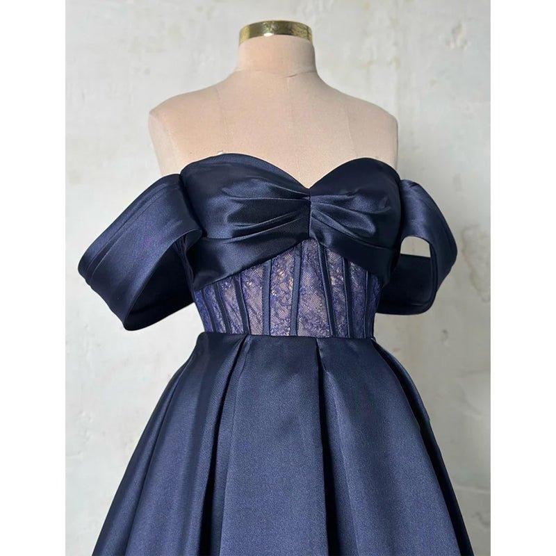 Vestido largo de fiesta formal de satén con encaje transparente y hombros descubiertos, corte en A