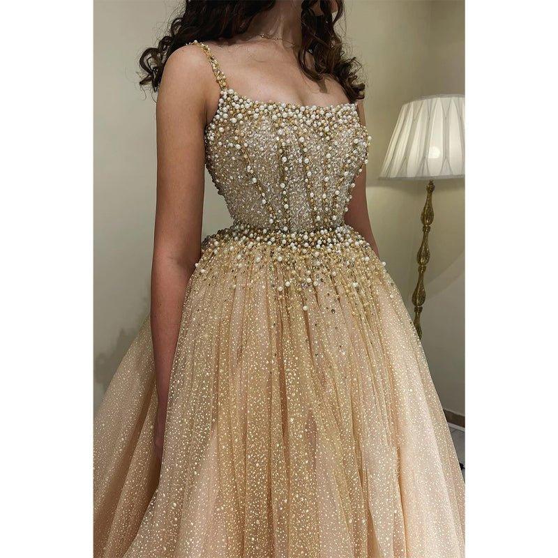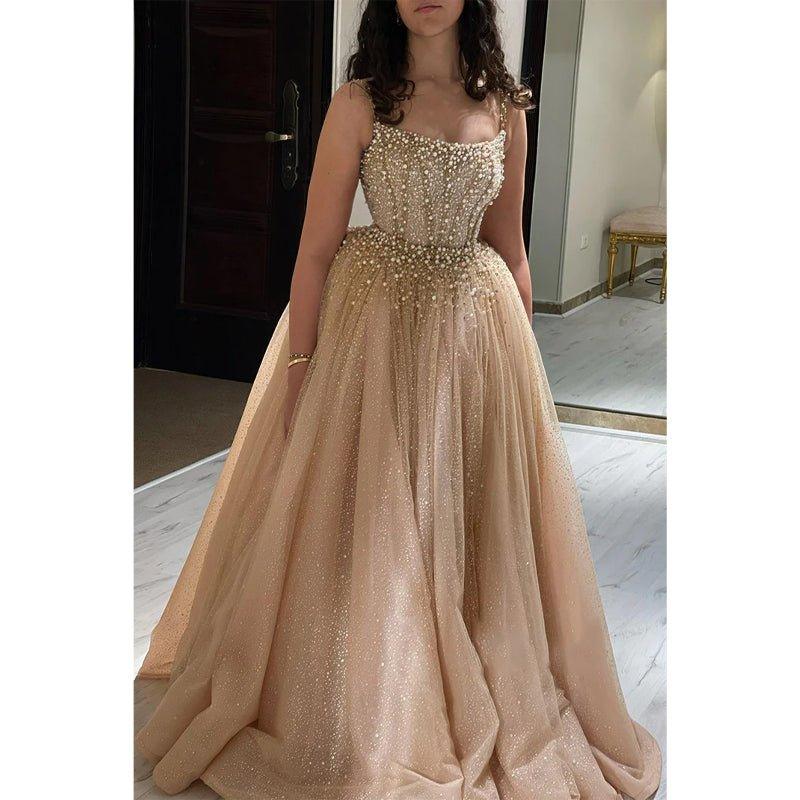 Vestido largo de noche formal de lujo con escote redondo y falda desmontable, corte en A y cuentas.