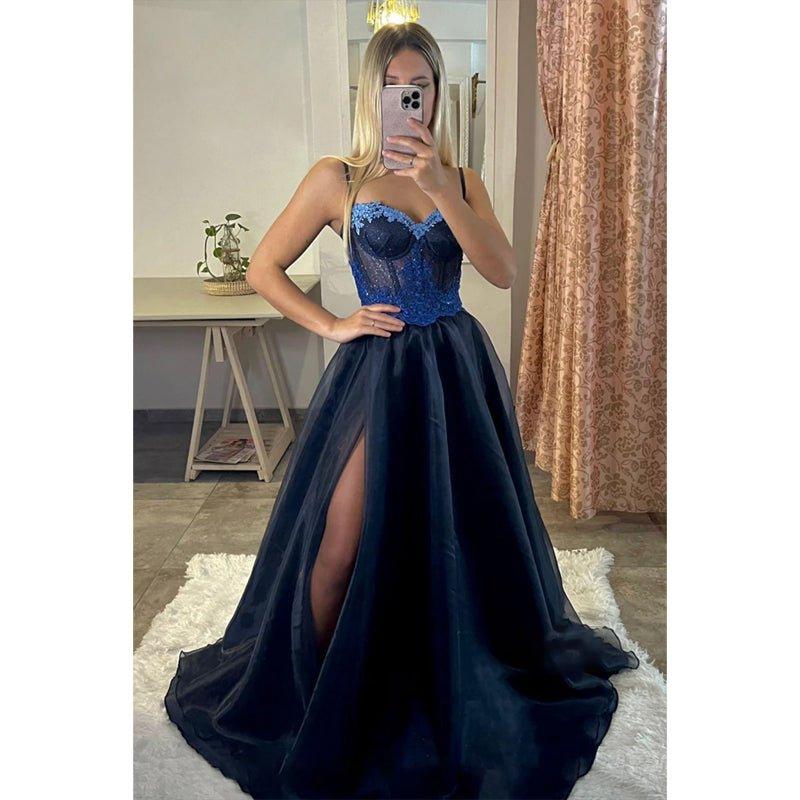 Vestido largo de fiesta con tirantes finos, corte en A, apliques de encaje y lentejuelas.