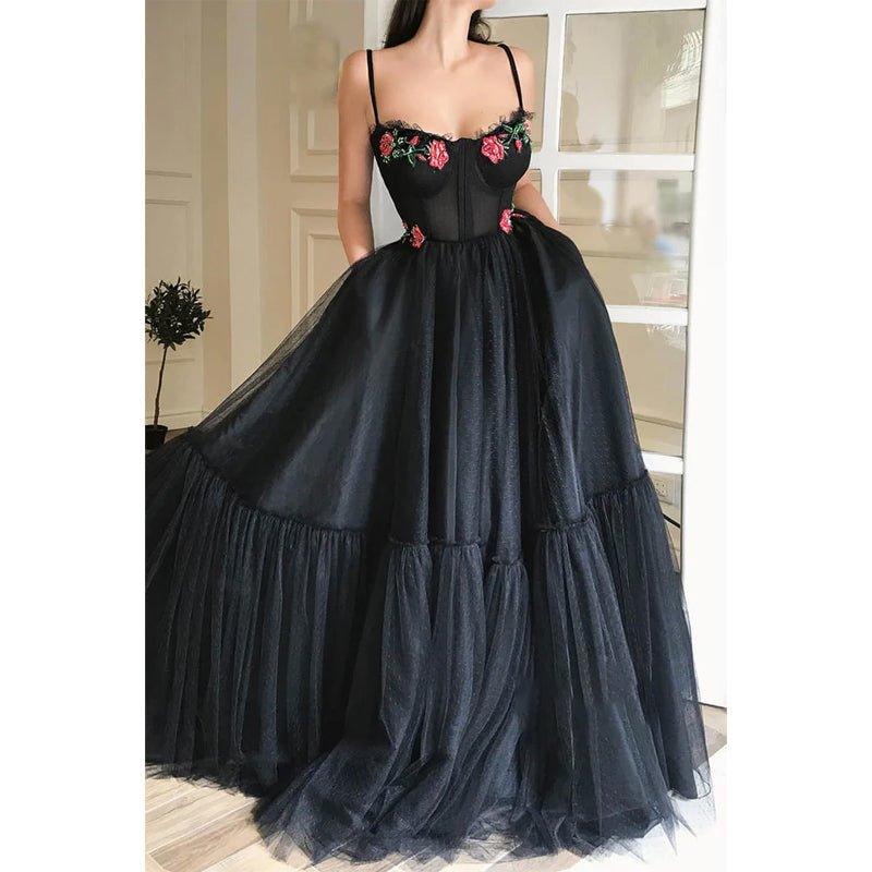 Vestido largo de fiesta de tul negro bordado con escote corazón y corte en A, con bolsillos.