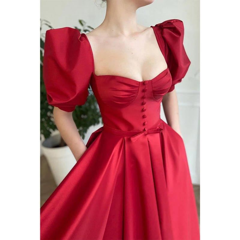 Vestido de fiesta rojo vintage de corte evasé, escote corazón, mangas cortas y bolsillos.