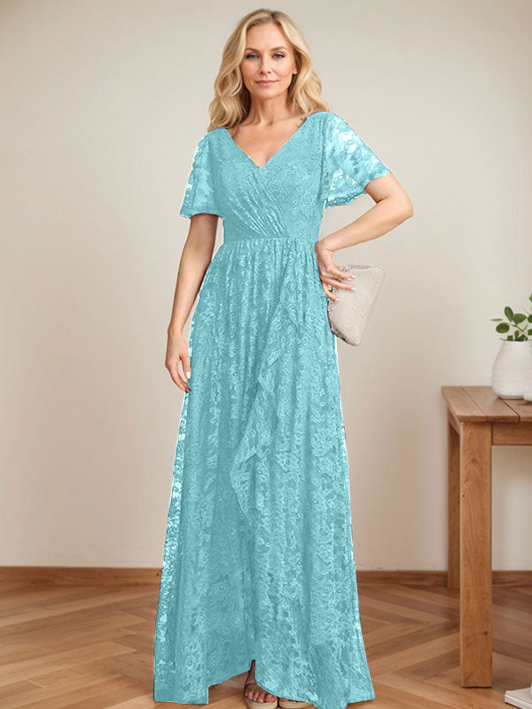 Vestido de novia de encaje asimétrico con escote en V y corte en A para la madre de la novia, con volantes en cascada.