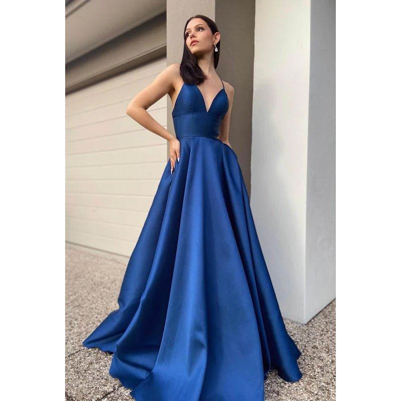 Vestido de fiesta de satén con escote en V, sin mangas y cremallera