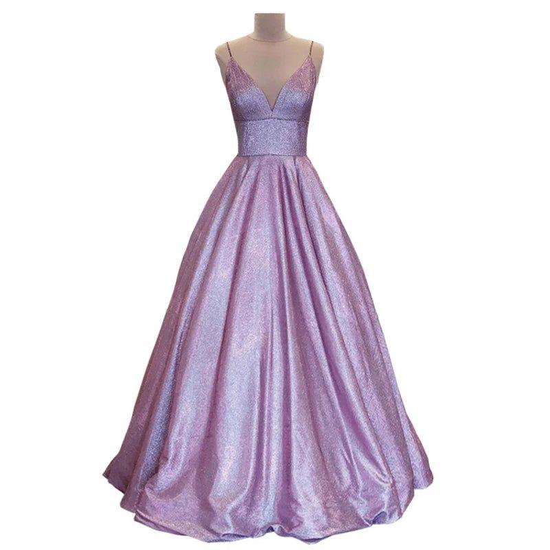 Vestido de fiesta largo con escote en V, tirantes finos y brillo, con bolsillos