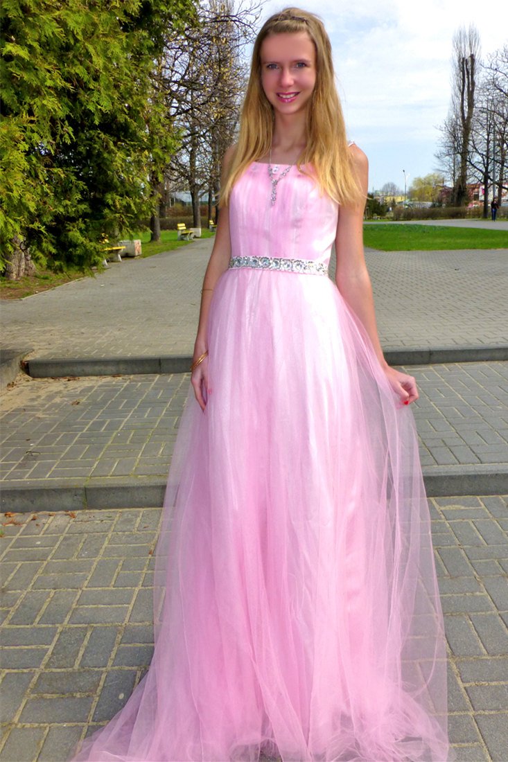 Vestido de graduación largo hasta el suelo, corte en A, tirantes anchos, tul trenzado con pedrería