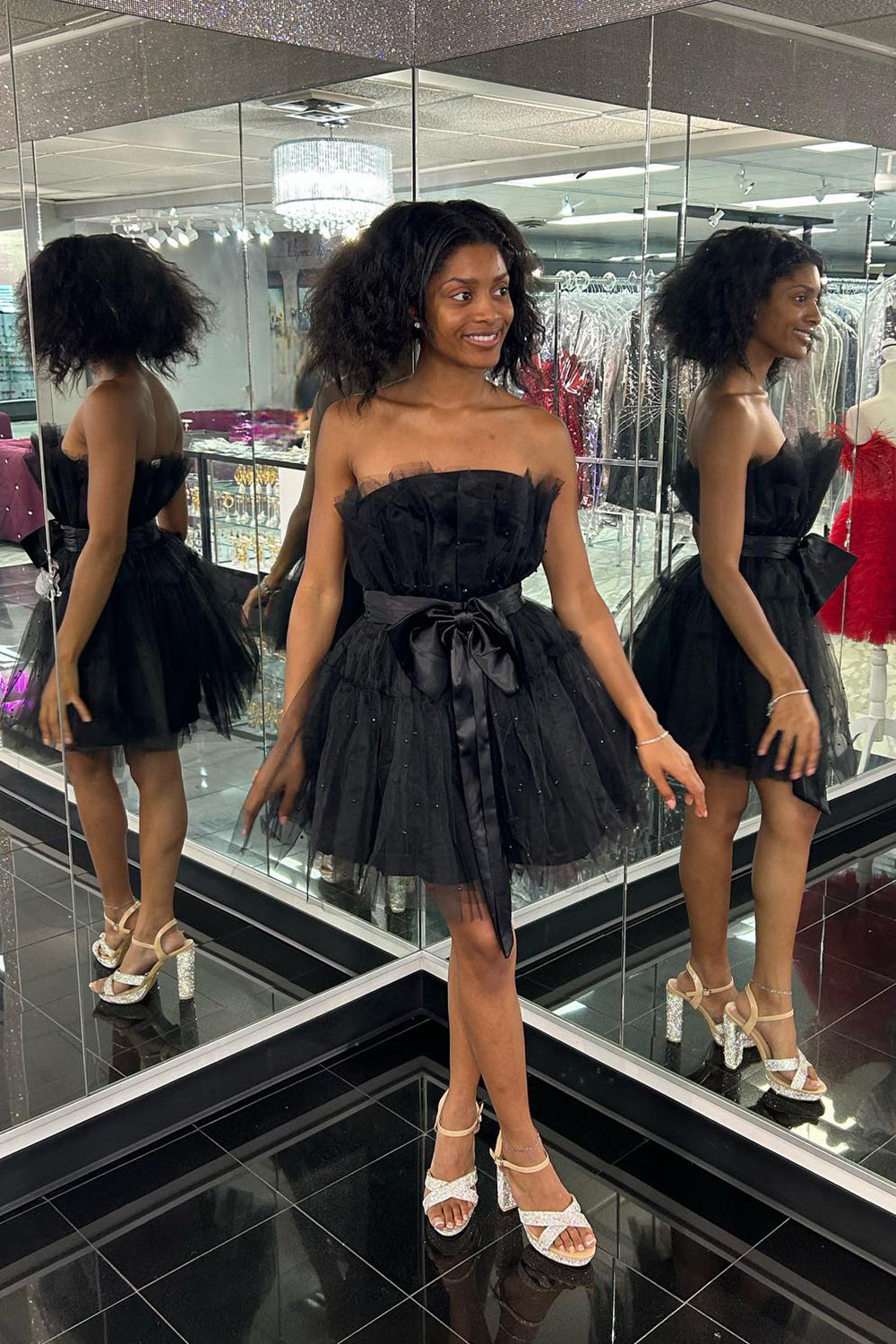 Vestido corto de fiesta de bienvenida sin tirantes, de tul, corte en A, con corsé y lazo.