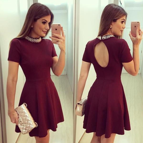 Vestido de fiesta barato color burdeos, cuello alto, manga corta, espalda con abertura en forma de ojo de cerradura y cuentas.
