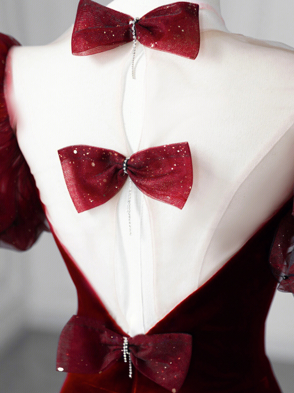 Vestido de noche elegante de sirena color burdeos con mangas abullonadas de terciopelo y lazo, modelo Y7674
