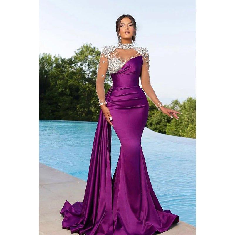 Vestido de fiesta formal de sirena con escote ilusión, cuentas de lujo y mangas largas