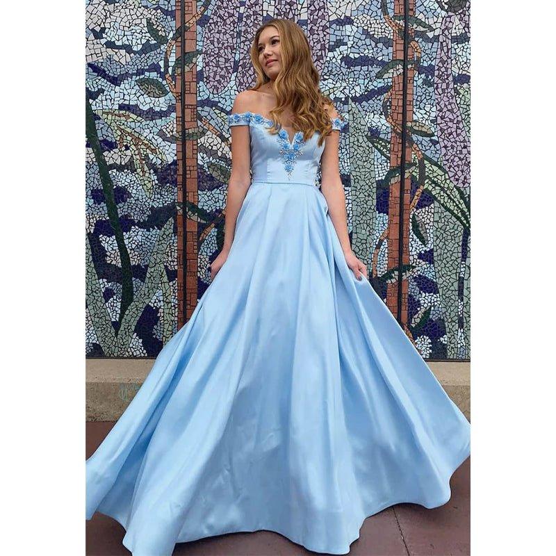 Vestido de fiesta largo elegante de satén azul cielo con hombros descubiertos y apliques 3D