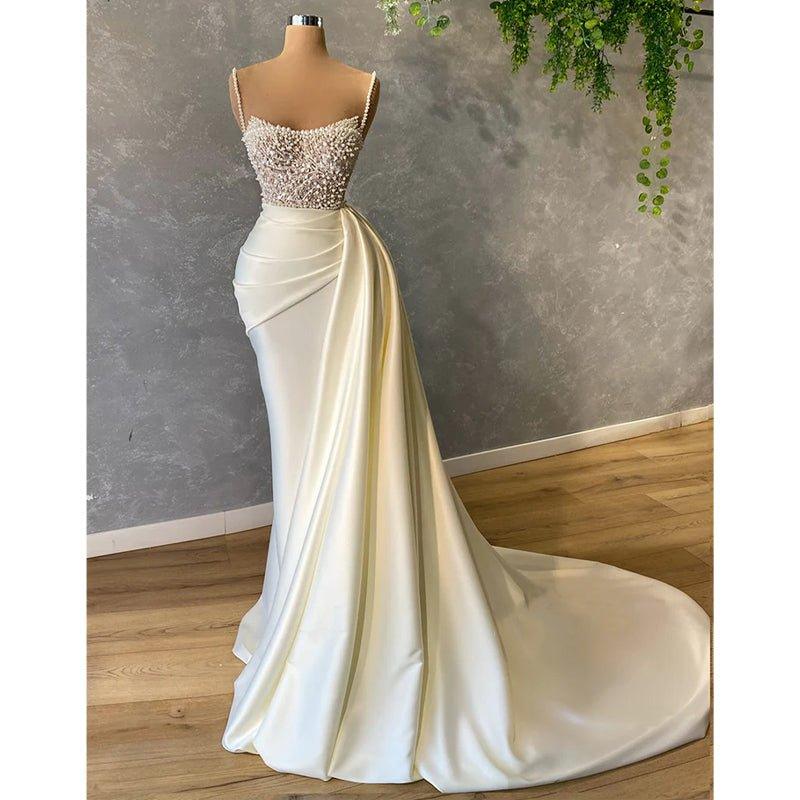 Elegantes vestidos de noche largos de satén con pliegues y tirantes de perlas y aberturas para graduación.