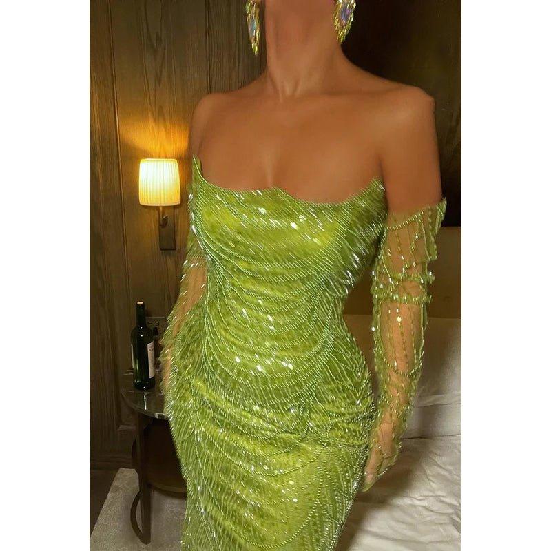 Vestido elegante y brillante de sirena con hombros descubiertos y mangas largas para fiesta de noche y graduación