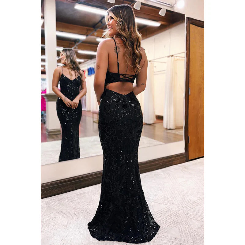 Vestido clásico moderno de sirena con escote en V y tirantes finos para fiesta de noche y graduación