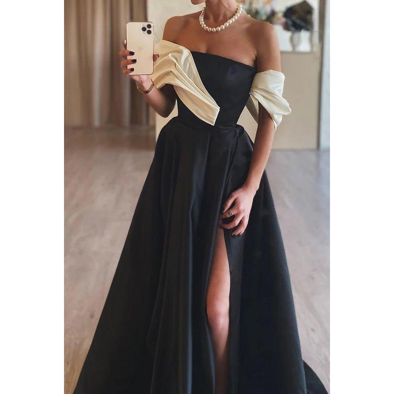Vestido clásico y atemporal de fiesta de noche con hombros descubiertos y mangas casquillo en forma de A