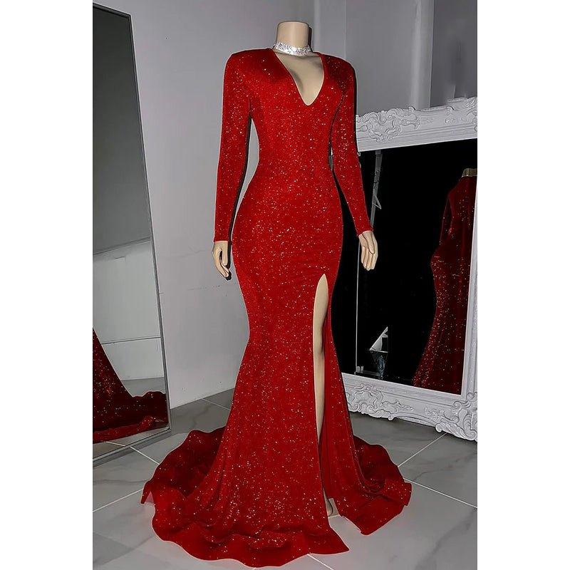 Vestido de fiesta de noche clásico y atemporal con escote en V, mangas largas, corte sirena, lentejuelas y abertura