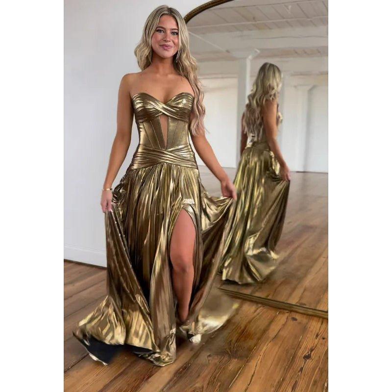 Vestido de fiesta de graduación con hombros descubiertos, corte A, sin mangas y abertura lateral, de alta costura y ornamentado