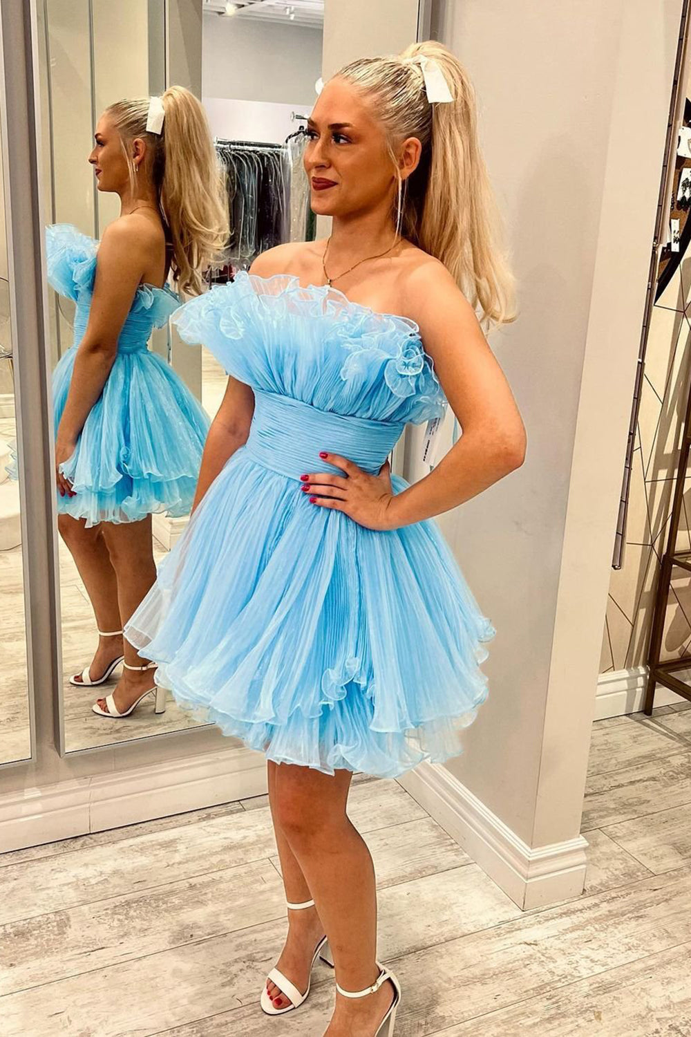 Lindo vestido corto azul de corte A sin tirantes para baile de bienvenida con volantes