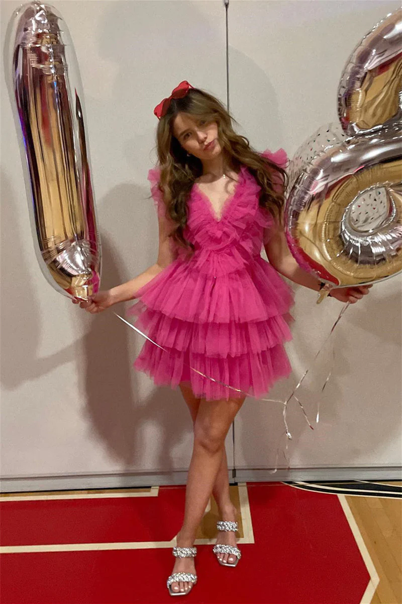 Lindo vestido corto de fiesta rosa con volantes y tul escalonado Y1995