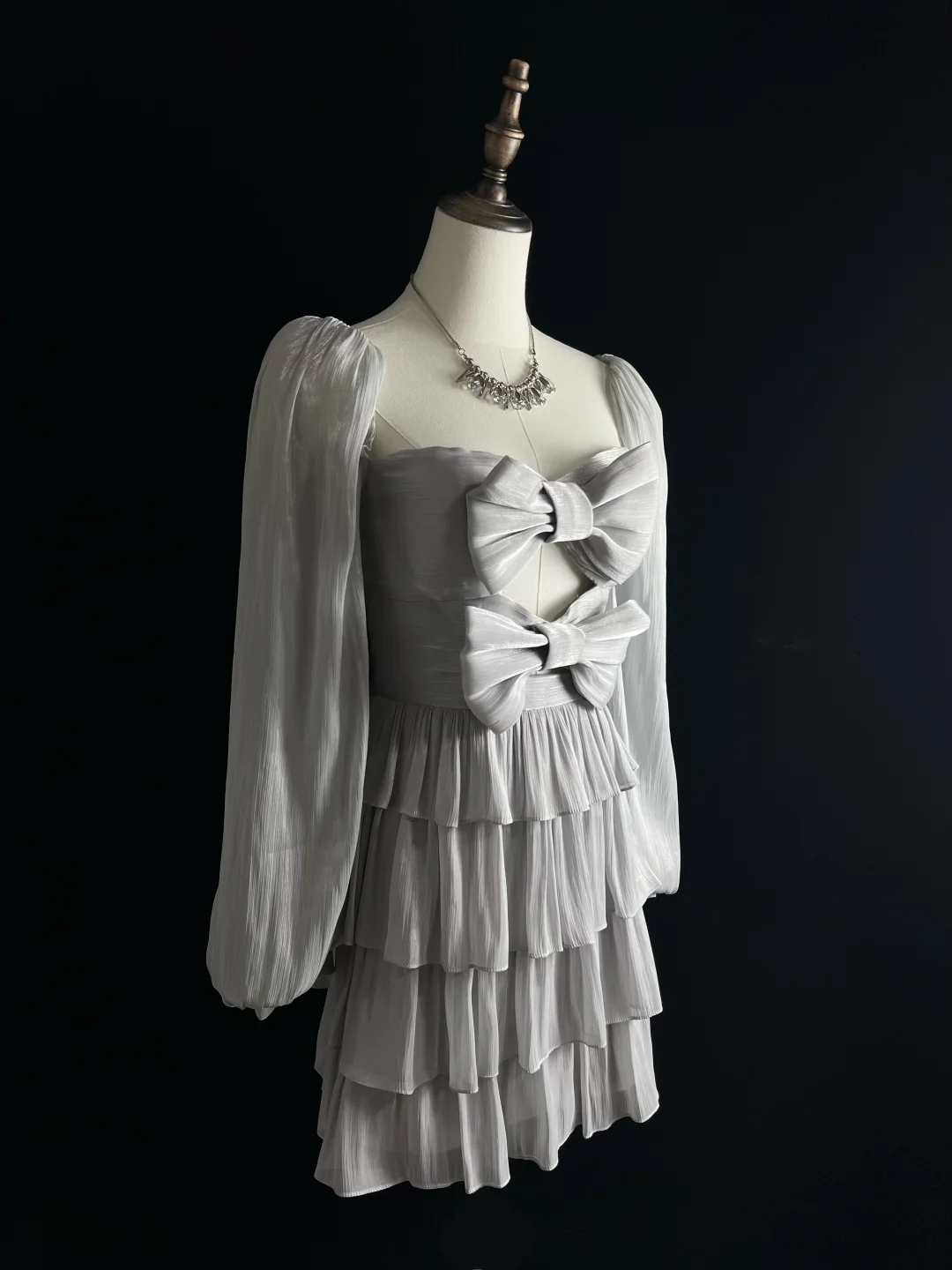 Lindo vestido corto de fiesta con lazo de tul gris plateado, corte en A y capas, estilo vestido de bienvenida Y8651