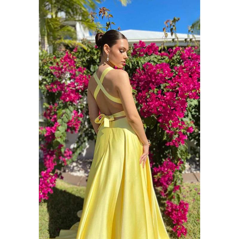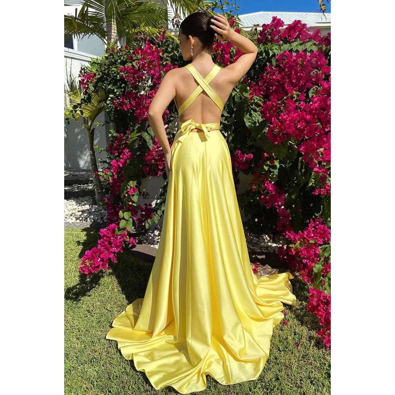 Vestido de fiesta de corte A con escote en V profundo, tirantes cruzados y abertura