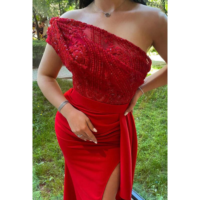 Elegante y lujoso vestido de fiesta con hombros descubiertos, mangas cortas, abertura lateral y fruncido