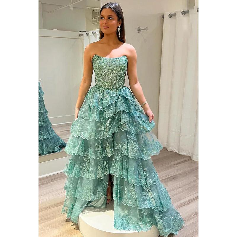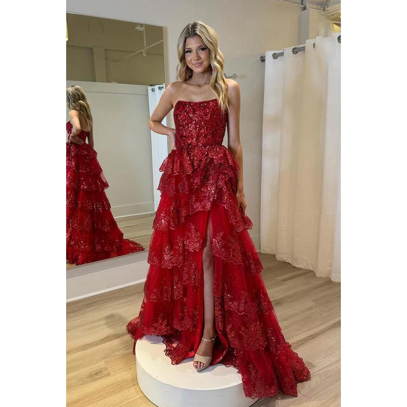 Vestido de fiesta glamuroso y dramático con hombros descubiertos, brillante, corte A, sin mangas y abertura