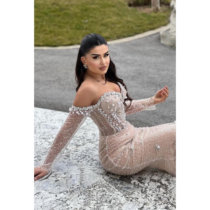 Vestido de fiesta glamuroso y dramático de corte trompeta/sirena con hombros descubiertos, mangas largas y cuentas
