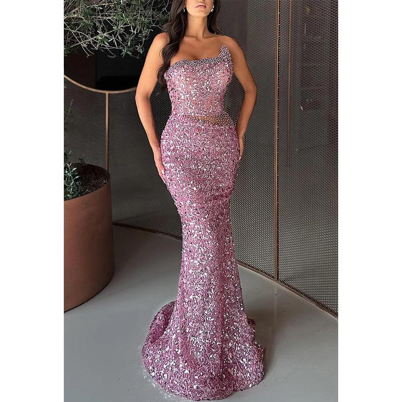 Vestido de noche para fiesta, graduación, sin tirantes, con cuentas y corte trompeta brillante