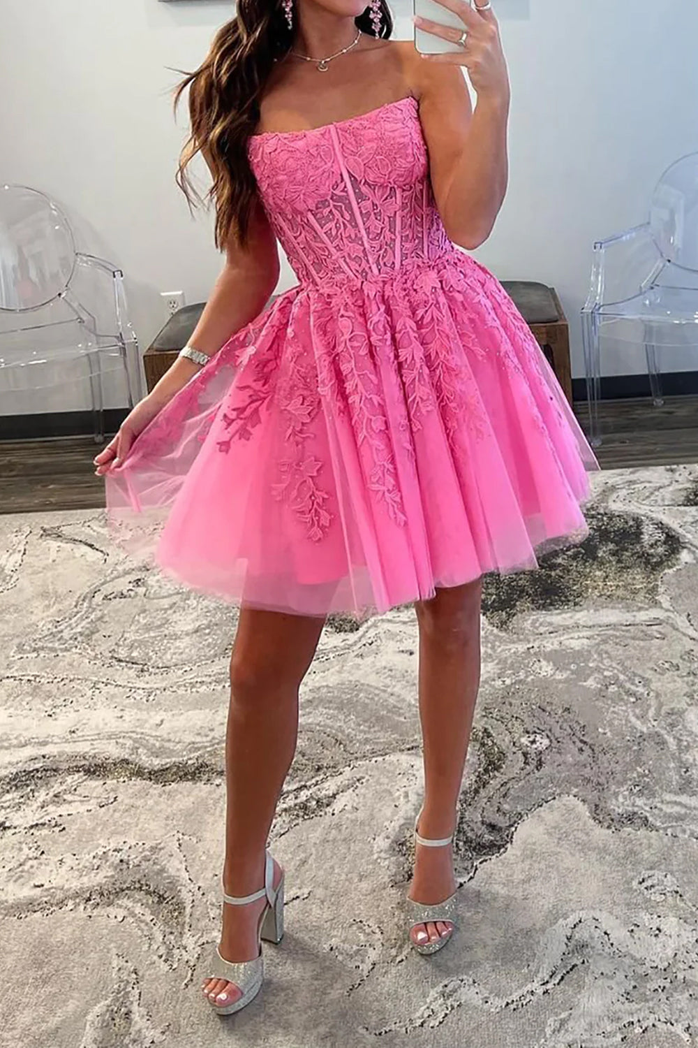 Precioso vestido rosa de fiesta de bienvenida, corte en A, sin tirantes, con corsé y apliques.