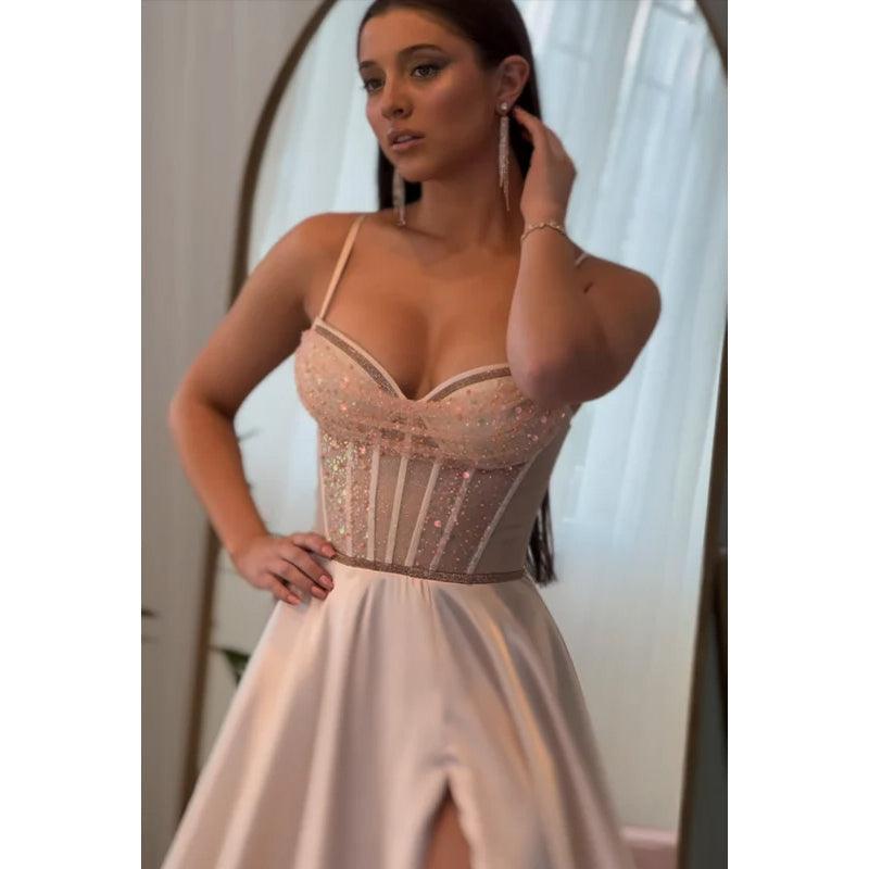 Hermoso y encantador vestido formal de fiesta con abertura y tirantes finos en forma de A