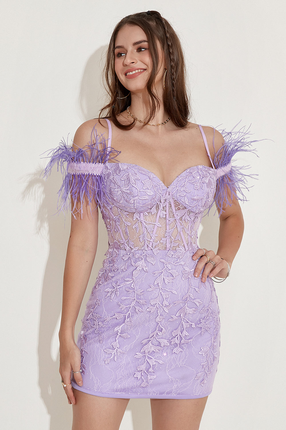 Vestido de fiesta lavanda con hombros descubiertos y plumas
