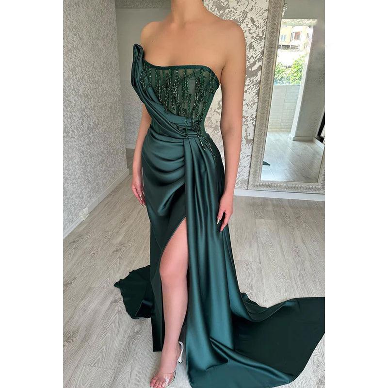 Vestido de noche largo de satén fruncido transparente con cuentas y abertura, sin tirantes