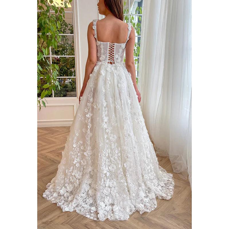 Vestido de noche largo de fiesta con escote cuadrado, apliques de encaje y tul, corte A y abertura