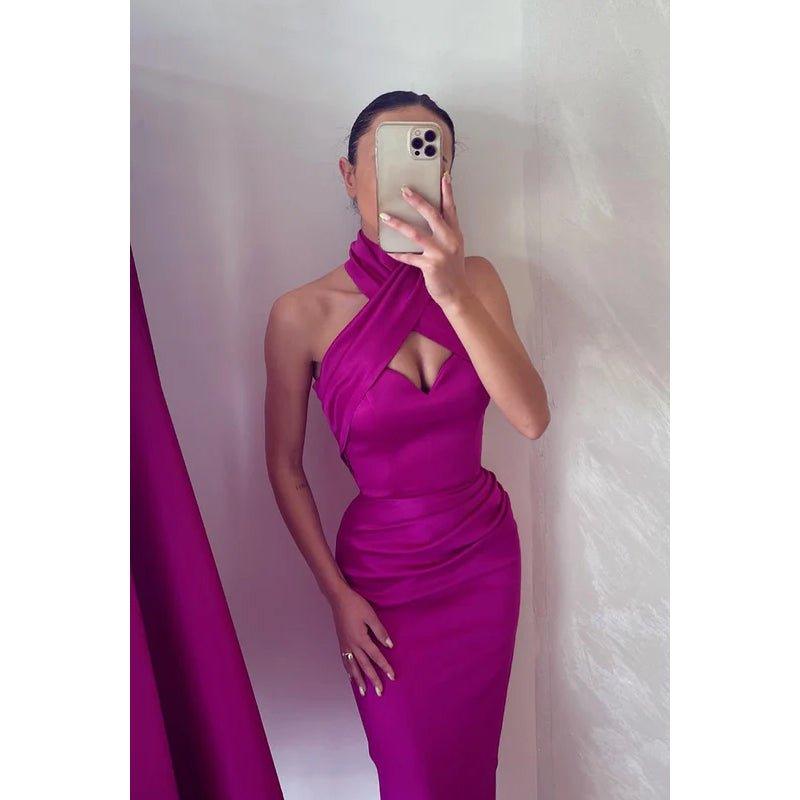 Vestido de noche largo de satén fruncido con cuello halter, sin mangas y escote cruzado