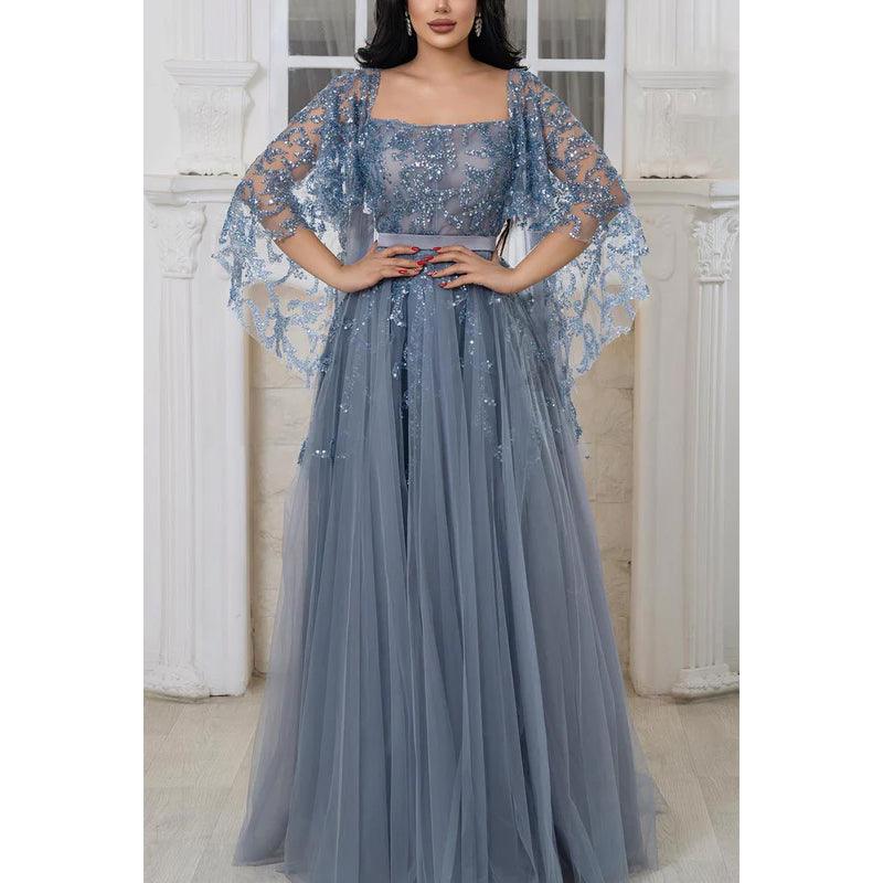 Vestido de noche largo de tul transparente con cuentas y mangas casquillo con escote cuadrado y corte A