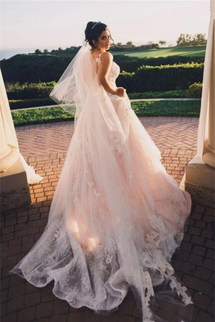 Detalles de la espalda: Cremallera Temporada: Primavera.Verano.Otoño.Invierno Escote: Tirantes finos Material: Encaje Silueta: Línea A Tipo de cuerpo: Señorita Tren: Tren de la capilla Largo de manga: Sin mangas Cintura: Natural Largo del dobladillo: Hasta el suelo Adornos: Apliques