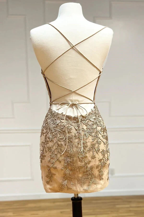 Vestido corto ajustado de encaje rojo, escote en V, tirantes finos y corte recto para baile de bienvenida. MH584