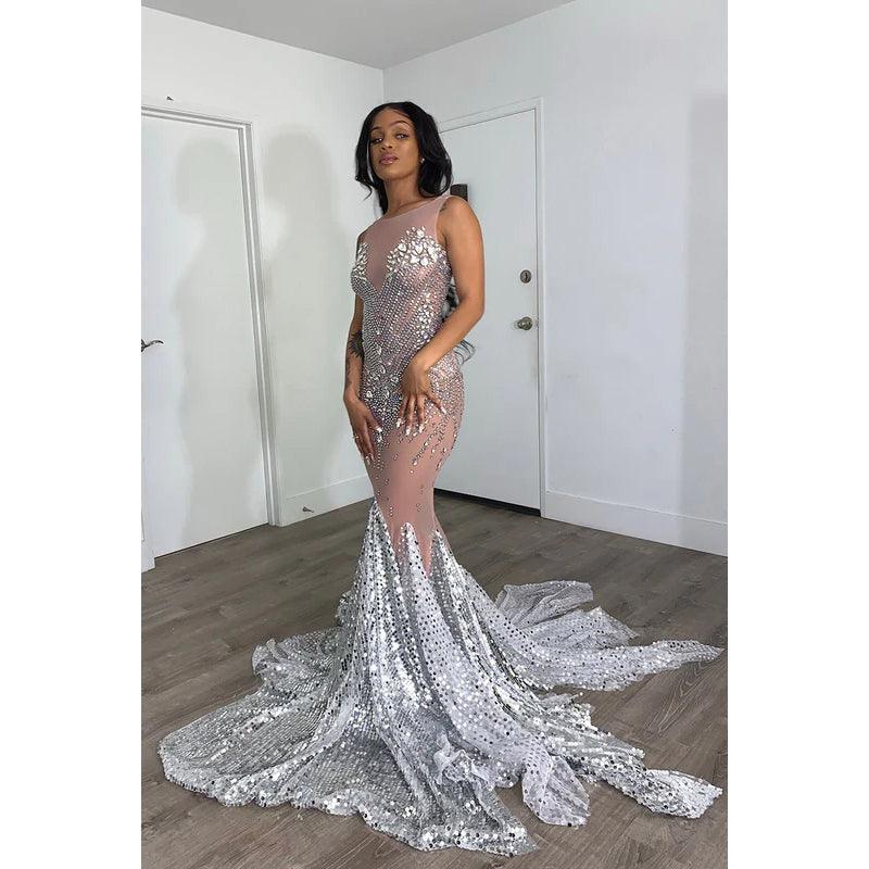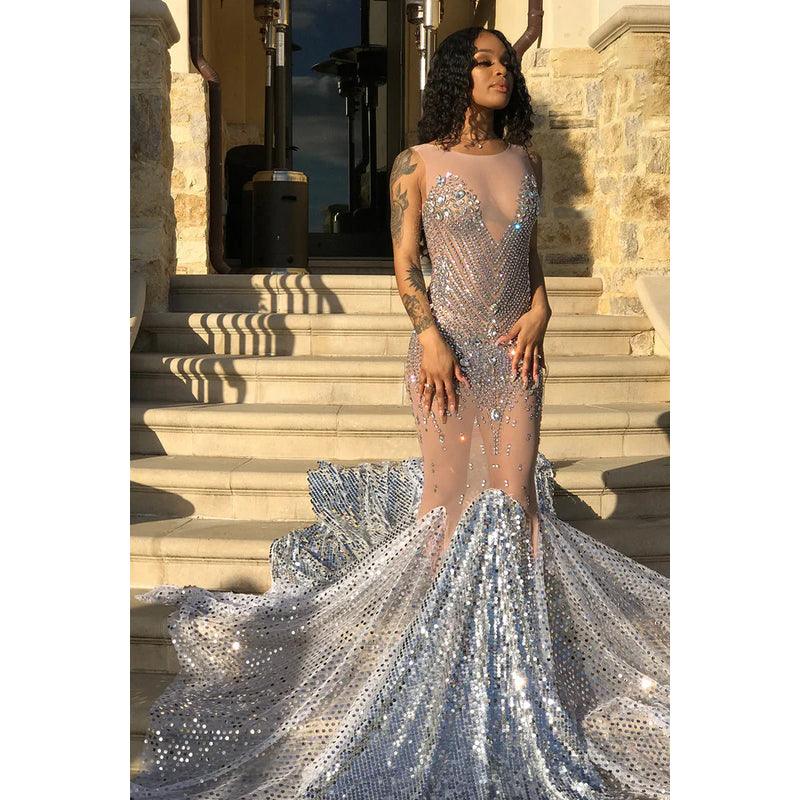 Vestido de fiesta largo estilo sirena de tul transparente con cuentas y sin mangas con cola larga