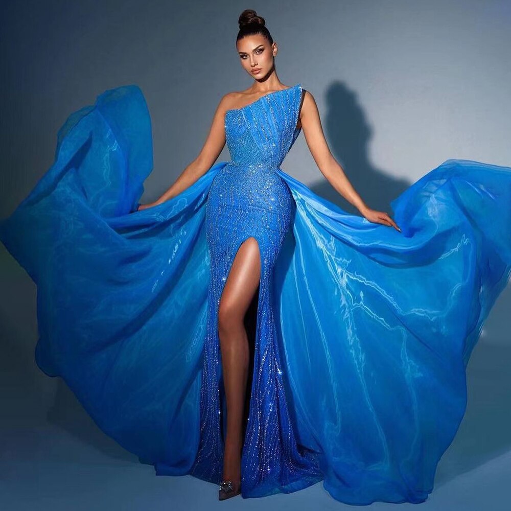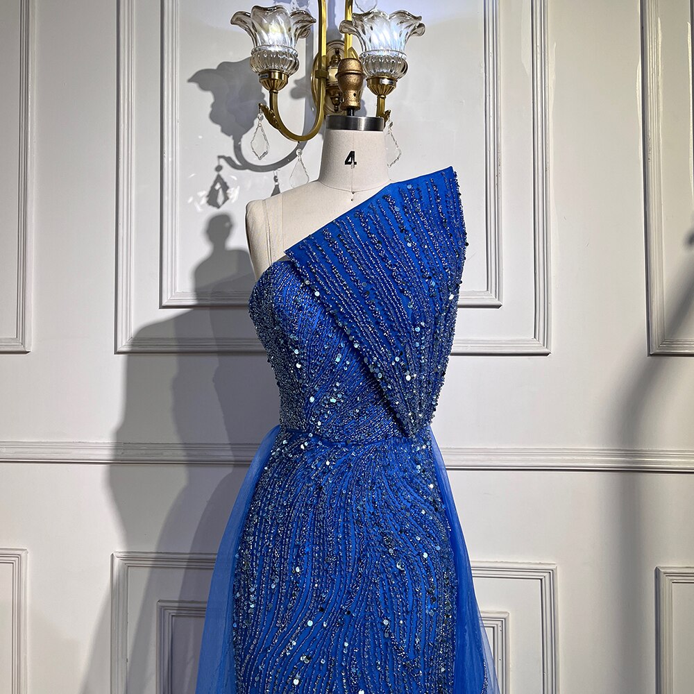 Vestidos de noche de lujo con cuentas, estilo árabe, azules, sin tirantes, con abertura alta, de Dubái, para mujer, para bodas y fiestas 2025 LA71921