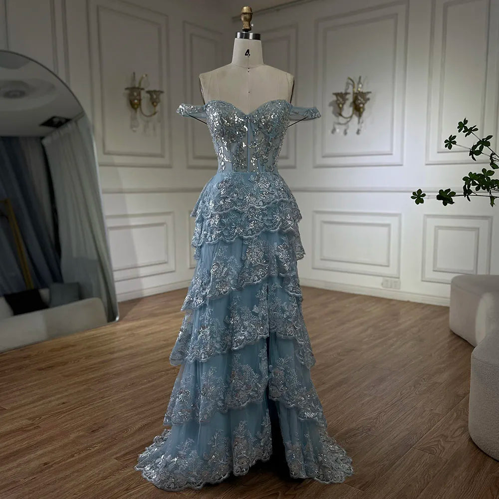 Vestido de noche árabe azul con tirantes finos, falda escalonada con cuentas y abertura frontal para mujer - Boda 2025 LA72593