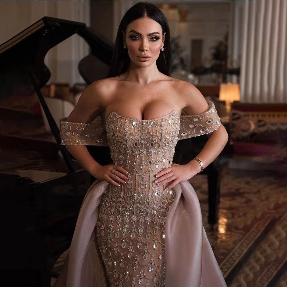 Su lujoso color champán, su intrincado diseño de sirena y la sobrefalda añadida te harán destacar en cualquier evento. La elección perfecta para un look sofisticado y glamuroso.