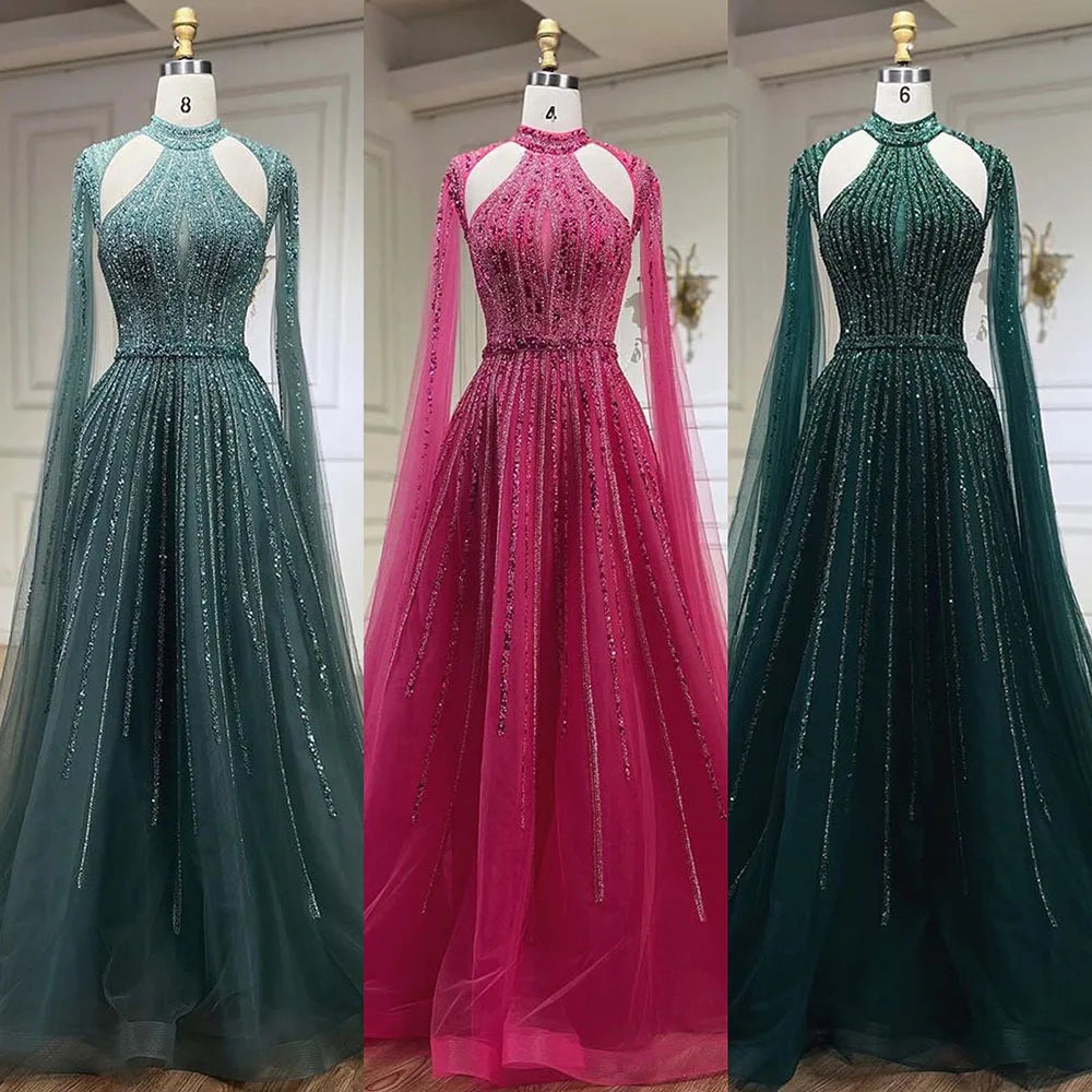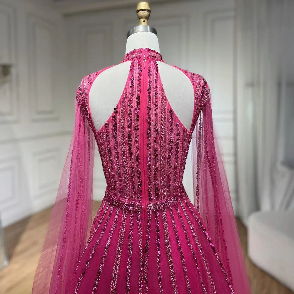 Vestidos de noche de lujo estilo Dubái, corte en A, manga capa, con cuentas, color fucsia árabe, para mujer, ideales para bodas y fiestas (2025) LA72306