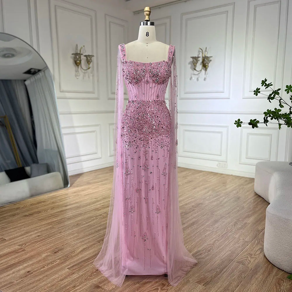 Vestido largo de noche elegante de lujo estilo sirena, color gris árabe, con cuentas, mangas tipo capa, ideal para fiestas 2025 LA72592