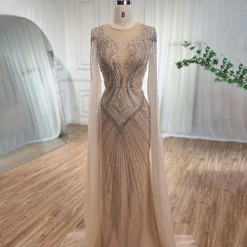 Vestidos de noche elegantes con cuentas, estilo sirena, color nude, con mangas tipo capa, de inspiración árabe. Vestidos de lujo para mujer, ideales para bodas y fiestas. Colección 2025. LA72165