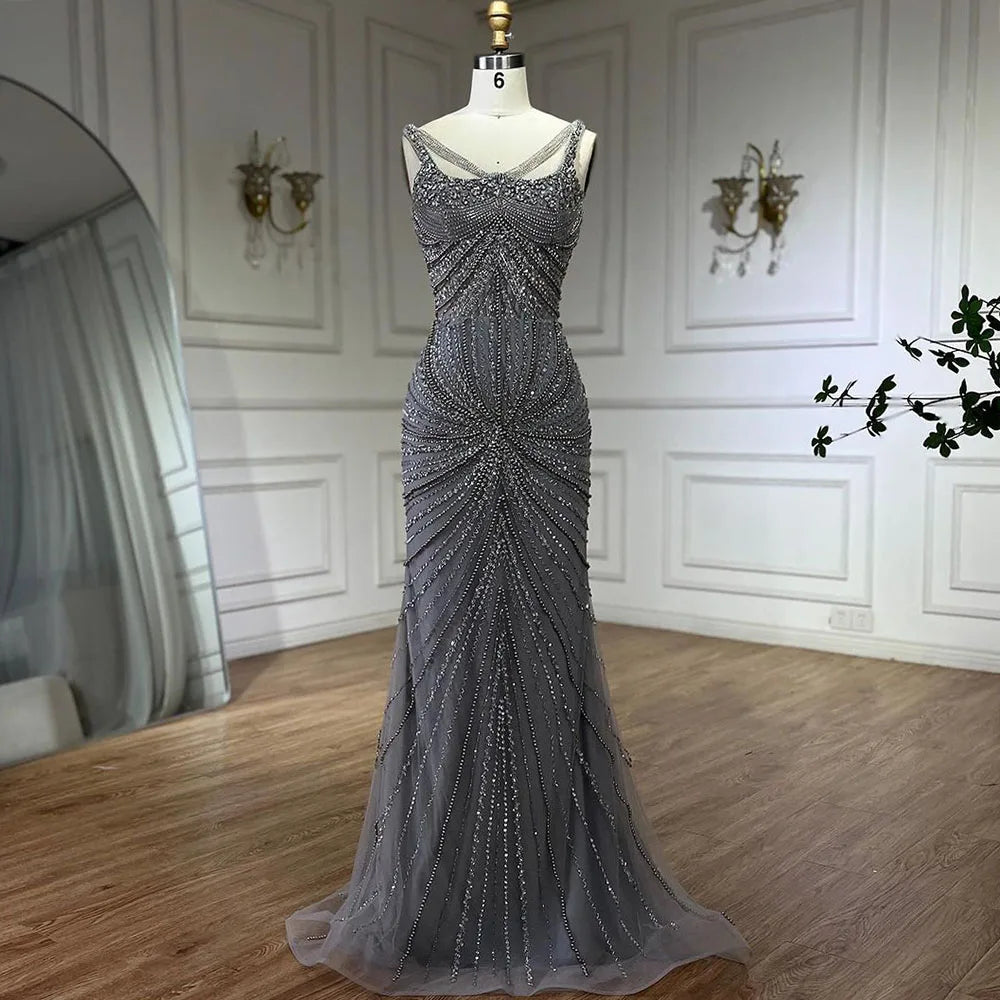 Vestidos de noche estilo sirena, color nude, con tirantes finos, adornados con perlas y cuentas, ideales para bodas y fiestas (2025) LA72356
