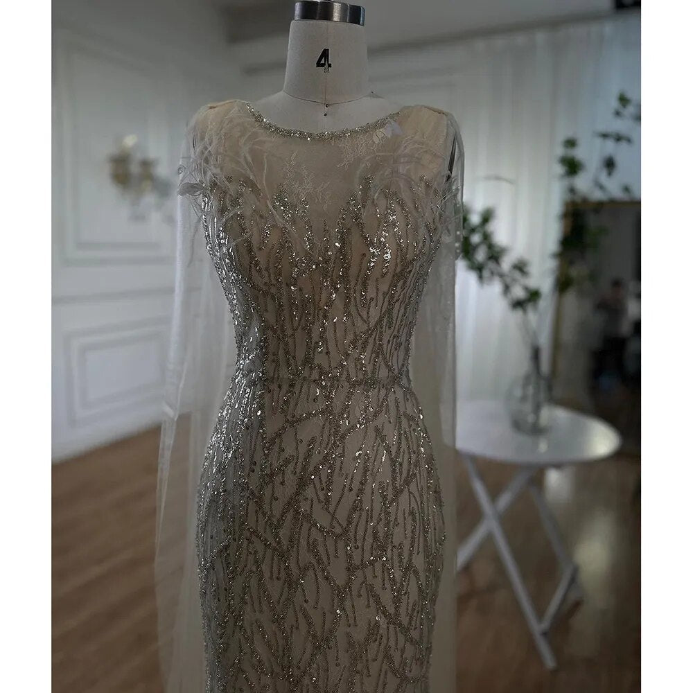 Chal de sirena beige con hilo, sexy, con cuentas y plumas, vestidos de noche de lujo de Dubái, colección 2025 para mujer, para fiestas, LA72142