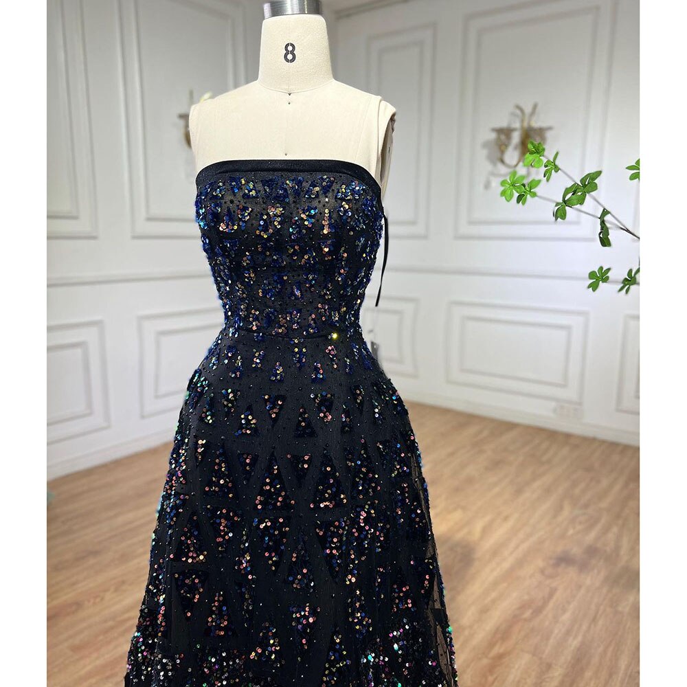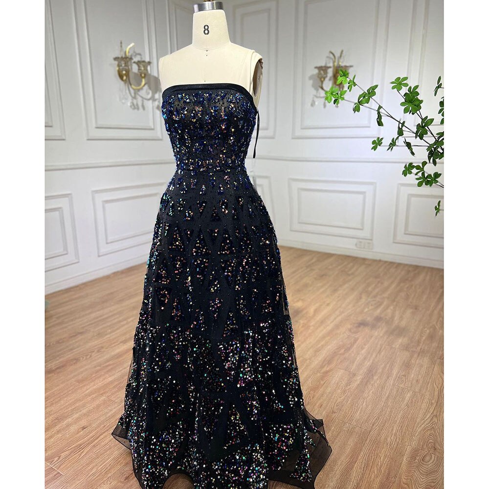 Vestido de noche elegante negro de corte A, con hombros descubiertos, lujoso, con lentejuelas y cuentas, para mujer, modelo LA72108
