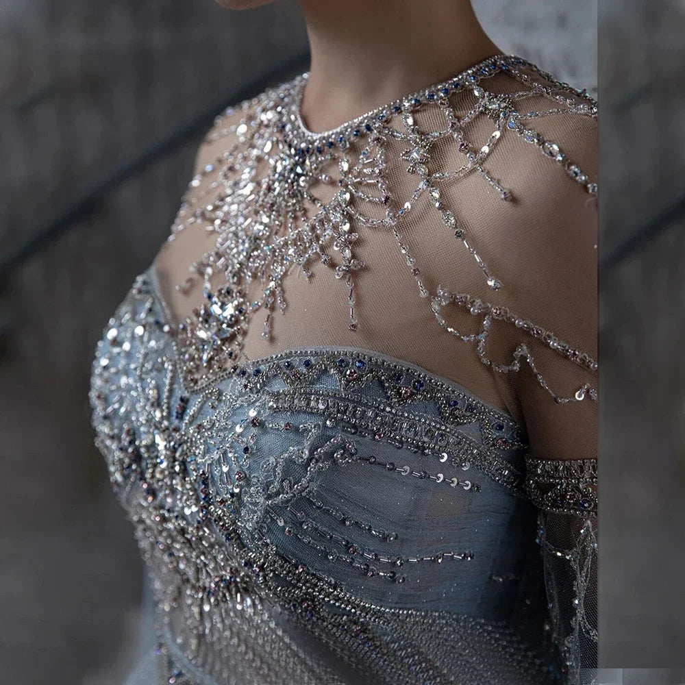 Vestido de noche de lujo azul estilo árabe, corte en A, mangas tipo capa, cuello redondo, lazo y cuentas, para mujer, ideal para fiestas (LA71831)