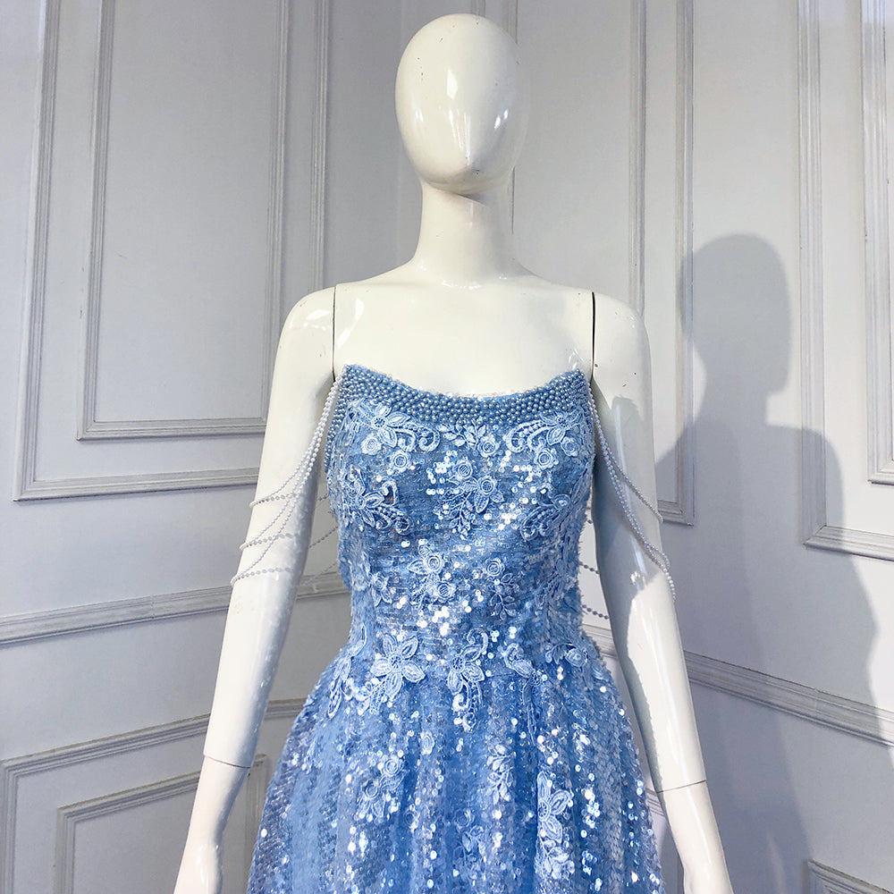 Haz que tu día especial sea aún más especial con este vestido de novia rústico azul cielo con cola corta (WD289). Su hermoso tono azul cielo creará un ambiente romántico y sofisticado para tu boda en la playa o en un entorno rústico. La...