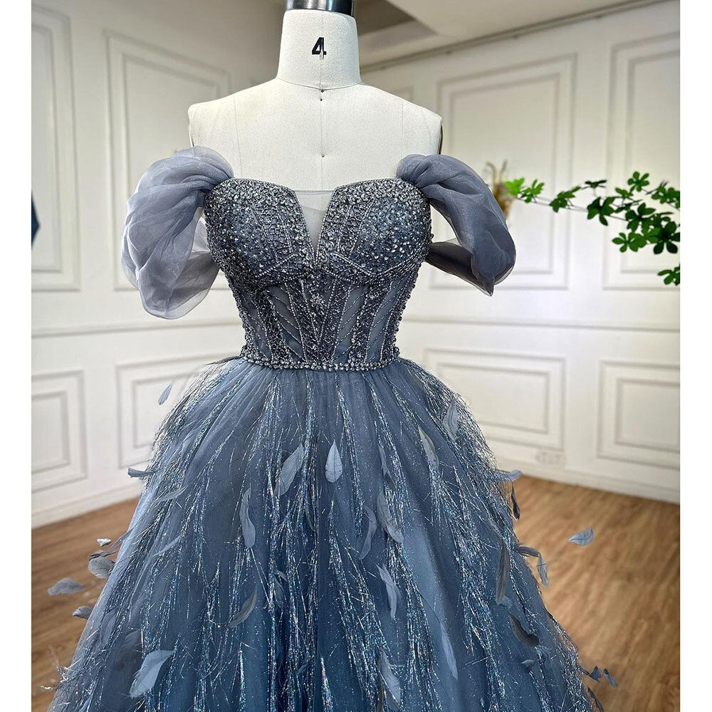 Vestido de noche de lujo azul, corte A, sexy, con hombros descubiertos, cuentas y plumas, para mujer, ideal para bodas y fiestas 2025 LA72120